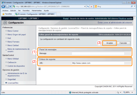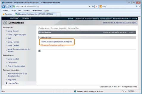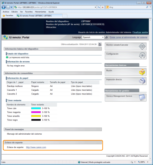 Podrá poner mensajes del administrador en un panel de mensajes de la página del portal de la IU remota. Además, podrá establecer enlaces para información acerca del soporte de la impresora en el enlace de soporte de la página del portal y hacerla accesible desde la IU remota cuando sea necesario.
