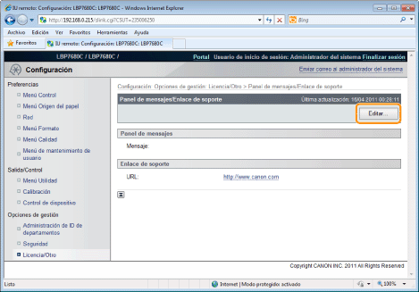 Cuando inicie una sesión en modo administrador de sistema, podrá cambiar los mensajes del panel de mensajes y cambiar el destino de enlace de los enlaces de soporte.