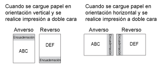 Especifica qué borde del papel se encuadernará, el lado largo o el lado corto. Cuando efectúe una impresión a doble cara, la impresora ajusta la ubicación de la encuadernación automáticamente de acuerdo con la superficie del papel.