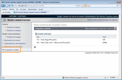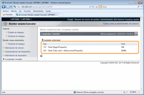 Podrá comprobar el número de páginas impresas utilizando la IU remota.