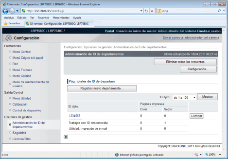 Registre más de un ID de departamento antes de habilitar la Administración de ID de departamento, que no tendrá ningún efecto si no hay ningún ID de departamento registrado.