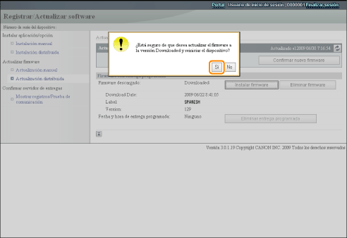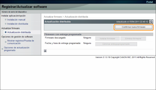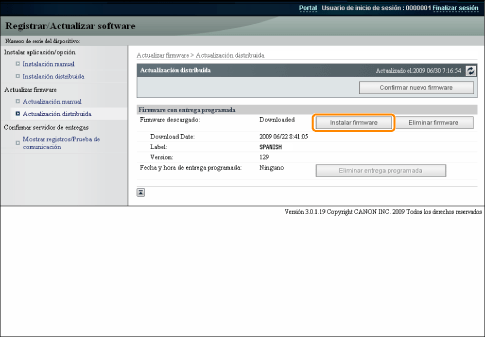 El firmware se aplicará tras la descarga del nuevo firmware del servidor de entrega. Cuando finalice su aplicación, la impresora se reiniciará automáticamente. ![]() Programación de entrega se establezca en [Entregar ahora] y Modo de instalación se configure en [Manual]