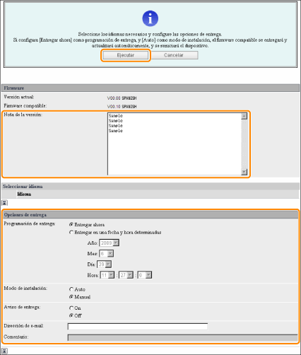 Programación de entrega y Modo de instalaciónProgramación de entrega se establezca en [Entregar ahora] y Modo de instalación se configure en [Auto]