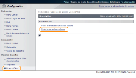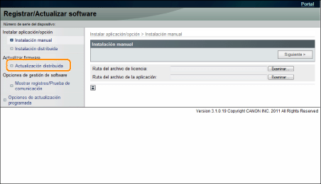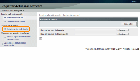 Tiempo estimado necesario para aplicar el firmwareEl tiempo necesario para aplicar el firmware descargado es de aproximadamente 20 minutos. Esta operación podría requerir más tiempo en función de la configuración del sistema y del entorno de red de su impresora.
