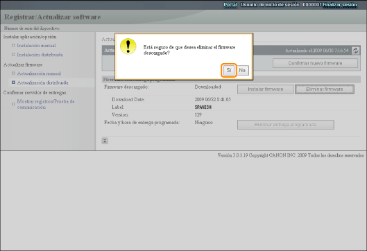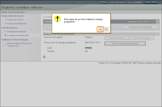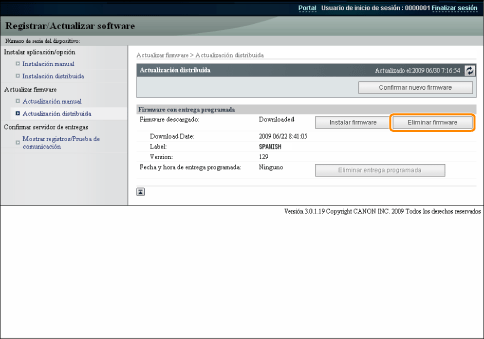 El nuevo firmware se descargará. ![]() Cuando Programación de entrega se establezca en [Entregar en una fecha y hora determinadas]