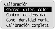 Ejecuta [Correc. difer. color] y [Control de densidad]. A ejecutar cuando desea ajustar la diferenciar de color y el control de la densidad de imprisión (ajustar matices de color) de una sólo vez.