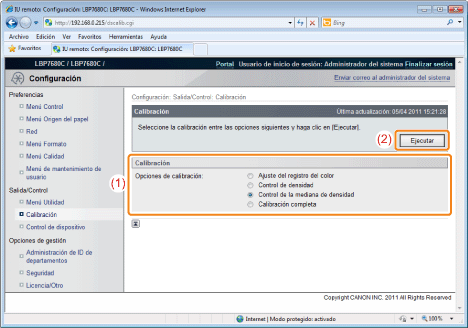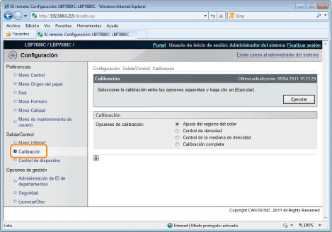 Precauciones cuando ejecuta una calibraciónSi ejecuta una calibración frecuentemente, esto puede afectar a la vida útil de los cartuchos de tóner.