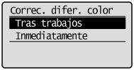 La falta de coincidencia de color de impresión se ajusta inmediatamente después de encender la impresora. Si se ejecuta inmediatamente el ajuste de falta de coincidencia de color después de encender la impresora, tardará un tiempo antes de que se pueda imprimir.