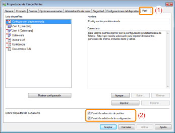 Cuando las casillas de verificación [Permitir la selección de perfiles] y [Permitir la edición de la configuración] no estén marcadas, la selección y la edición de "Perfil" estarán restringidas.