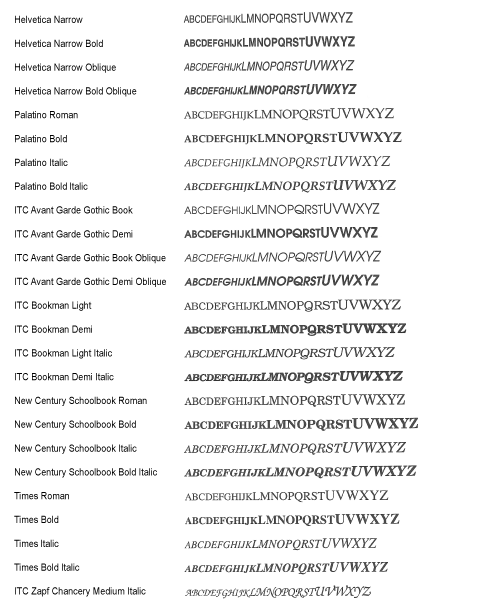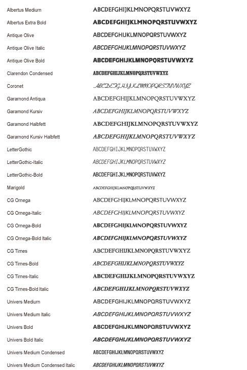 La lista de fuentes que se imprimen desde el menú [Menú utilidad] incluye una lista completa de todas las fuentes disponibles actualmente. La lista contiene los nombres y las muestras de impresión de las fuentes almacenadas en la impresora.