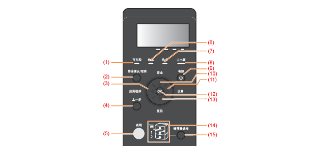 作业 指示灯亮起或闪烁(正在处理或接收数据时)时按下,显示作业列表。从列表中选择一项作业,可取消作业。此按键在本手册中表示为 [