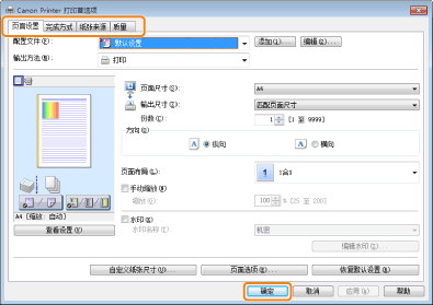 单击 [页面设置]、[完成方式]、[纸张来源] 和 [质量] 页的选项卡,然后指定所需项目。