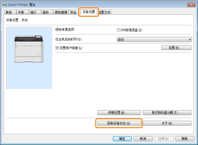 如果打印机和计算机通过 USB 或 WSD(设备上的 Web 服务)端口连接,则不能使用 [获取设备状态] 功能。需要手动配置设置。