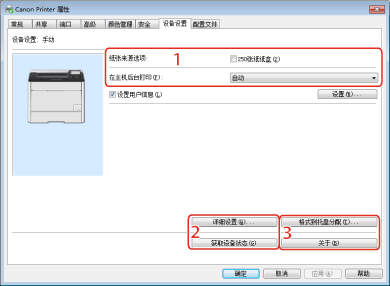 可获取设备信息并更新选项卡中显示的设置(请参阅“设置打印机选项”)。