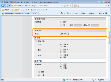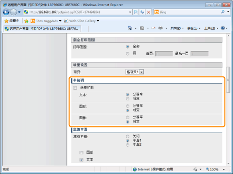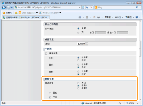 只有打印机驱动程序上的 [高级平滑] 设置为 [打印机默认设置],打印机控制台上的 [图形] 和 [文本] 设置才适合。