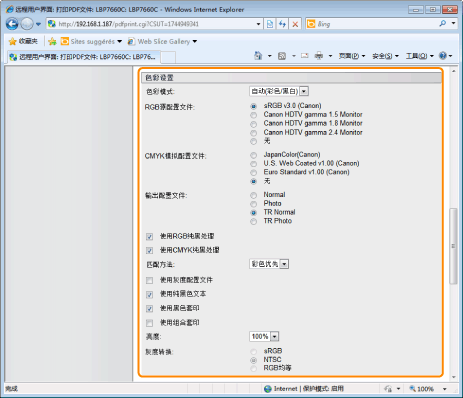 指定应用 [RGB源配置文件] 的打印方法,可选择机器上的显色方式,如下所示。