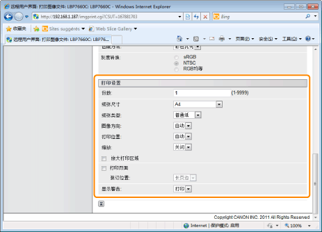 从 [自动]、[中央] 或 [左上] 中设置图像位置。选择 [自动] 时,如果在 TIFF 格式数据中指定打印位置,将在指定位置打印。如果未设置打印位置,则居中打印。由于 JPEG 格式中未指定打印位置,如果选择 [自动],则居中打印。