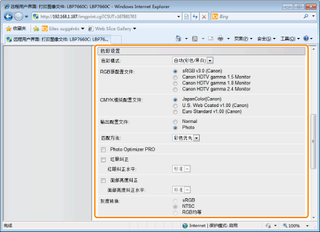 指定应用 [RGB源配置文件] 的打印方法,可选择机器上的显色方式,如下所示。