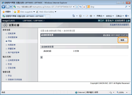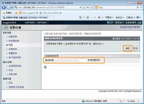 输入从打印机启动到打印机开始通信的启动时间(0 至 300 秒)。