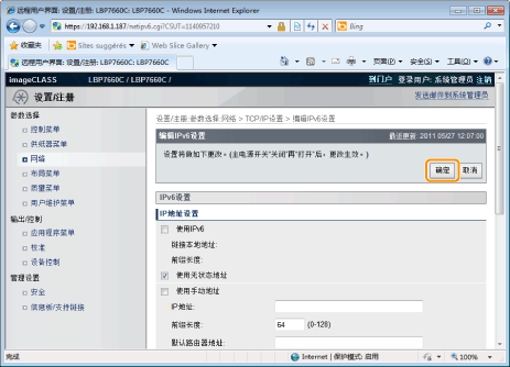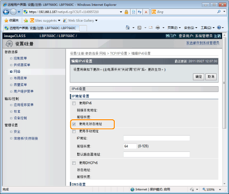 无状态地址保留选中 [使用无状态地址] 复选框后,打印机重新启动,自动显示无状态地址。打印机关闭时丢弃无状态地址。