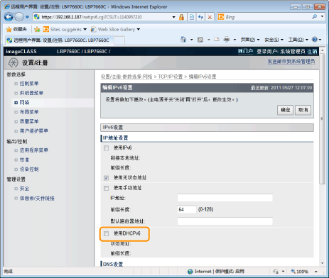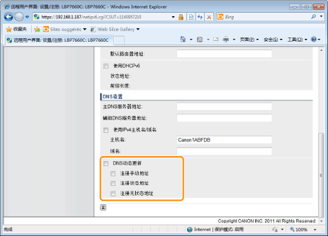 该功能可以在使用动态 DNS 服务器的环境下使用。 使用 DNS 动态更新功能时需要设置 DNS 服务器的 IP 地址、主机名和域名。
