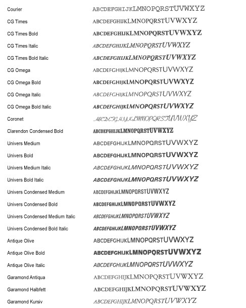 从 [应用程序菜单] 菜单打印的字体列表是当前可用的所有字体的综合列表。列表包含打印机上存储的字体名称和打印示例。