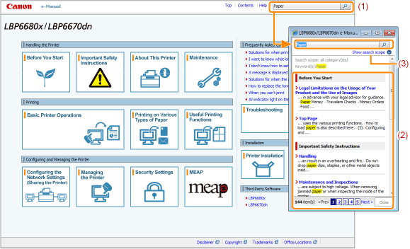Also, the AND search is available in the e-Manual so you can refine the search results by entering two or more keywords. When entering keywords, enter a space between the keywords.