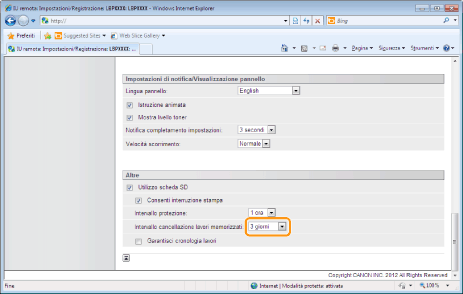 È possibile eliminare automaticamente i lavori memorizzati impostando il periodo di tempo che deve passare tra la memorizzazione e l'eliminazione dei lavori stessi.
