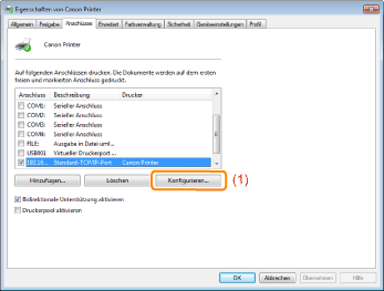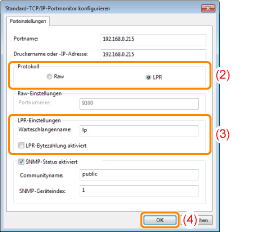 Wenn der Druckertreiber mit der oben aufgeführten Methode installiert wird, wird als zu verwendende Druckanwendung RAW angegeben. Wenn Sie LPD verwenden möchten, installieren Sie den Druckertreiber mit der oben aufgeführten Methode, und ändern Sie dann einen Anschluss.