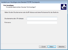 Der Wert, der in dem folgenden Dialog, der beim Einstellen eines Anschlusses angezeigt wird, in [Druckername oder -IP-Adresse] eingegeben wird, variiert abhängig von der Methode zur Festlegung der IP-Adresse des Druckers.