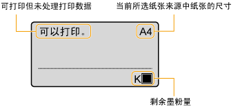 可打印指示灯(绿色)、 在线指示灯(绿色)和纸张来源指示灯(绿色)亮起,显示屏中出现 <可以打印。>,打印机可以打印。 |