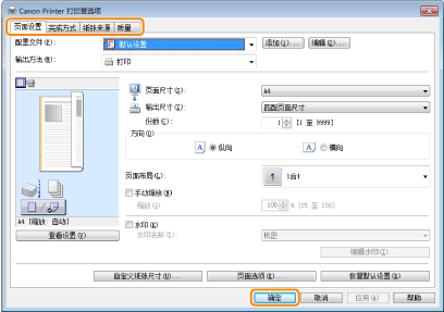 单击 [页面设置]、[完成方式]、[纸张来源] 和 [质量] 页的选项卡,然后指定所需项目。