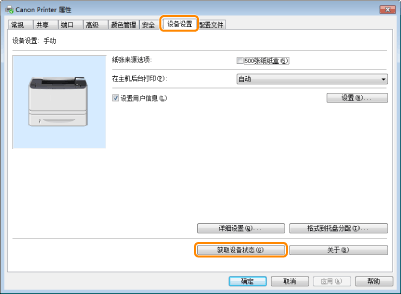 如果打印机和计算机通过 USB 或 WSD(设备上的 Web 服务)端口连接,则不能使用 [获取设备状态] 功能。需要手动配置设置。