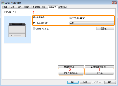 可获取设备信息并更新选项卡中显示的设置(请参阅“设置打印机选项”)。
