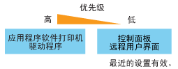 如果应用程序或打印机驱动程序与菜单功能之间相同项目的设置值不同,应用程序或打印机驱动程序中指定的设置有效。如果仅使用控制面板或远程用户界面指定菜单功能中的项目,则最近指定的设置有效。