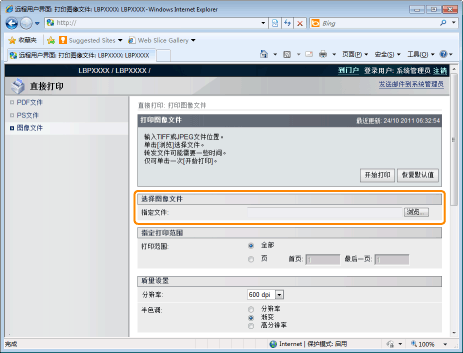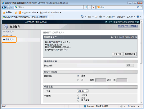 从 [自动]、[中央] 或 [左上] 中设置图像位置。选择 [自动] 时,如果在 TIFF 格式数据中指定打印位置,将在指定位置打印。如果未设置打印位置,则居中打印。由于 JPEG 格式中未指定打印位置,如果选择 [自动],则居中打印。