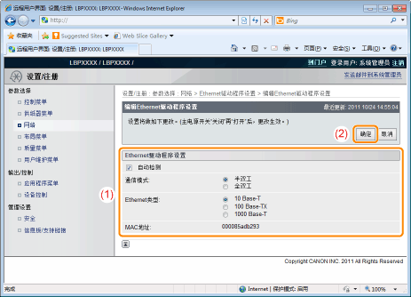 如果要固定通信方法和以太网类型的设置,请清除 [自动检测] 复选框,并进行下列设置。 使用 [通信模式],选择与所使用网络环境匹配的以太网通信方法。