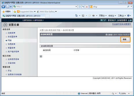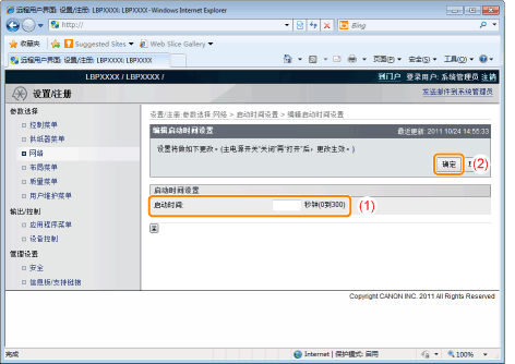 输入从打印机启动到打印机开始通信的启动时间(0 至 300 秒)。