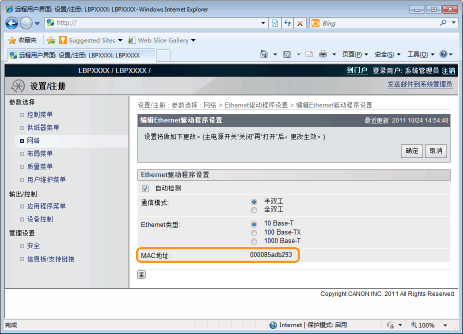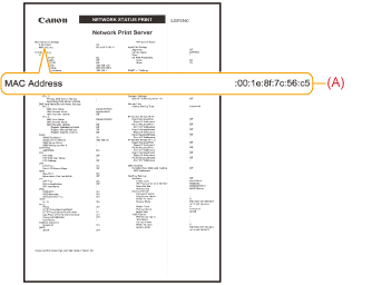 进行网络状态打印。MAC 地址 (A) 显示在网络状态打印左上角的 [Ethernet 驱动程序设置] 中。
