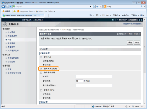 无状态地址保留选中 [使用无状态地址] 复选框后,打印机重新启动,自动显示无状态地址。打印机关闭时丢弃无状态地址。
