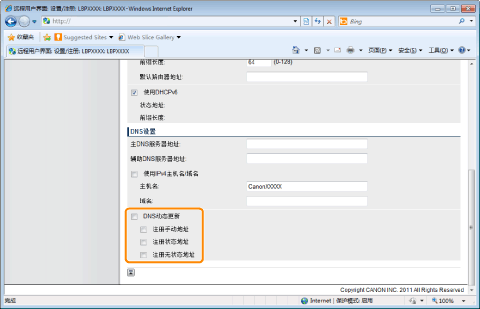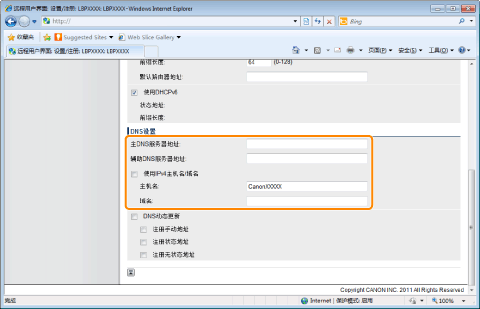 该功能可以在使用动态 DNS 服务器的环境下使用。 使用 DNS 动态更新功能时需要设置 DNS 服务器的 IP 地址、主机名和域名。