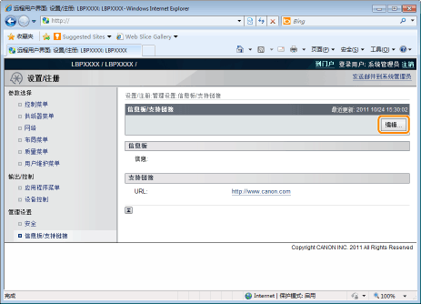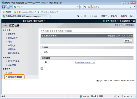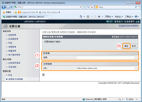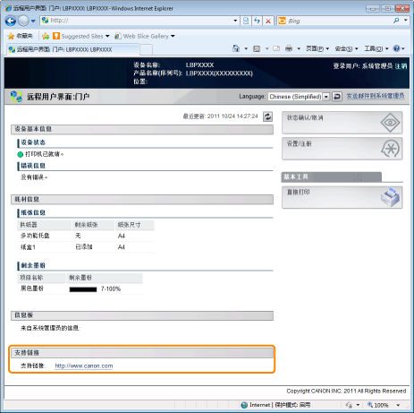 可将管理员的信息发布在远程用户界面门户页的留言板上。而且,可在门户页支持链接中设置打印机支持信息的链接,需要时可从远程用户界面访问。