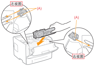将硒鼓两侧对准 (A) 打印机内硒鼓导轨的同时,将硒鼓牢牢地推入打印机中,直到触碰到打印机后沿。