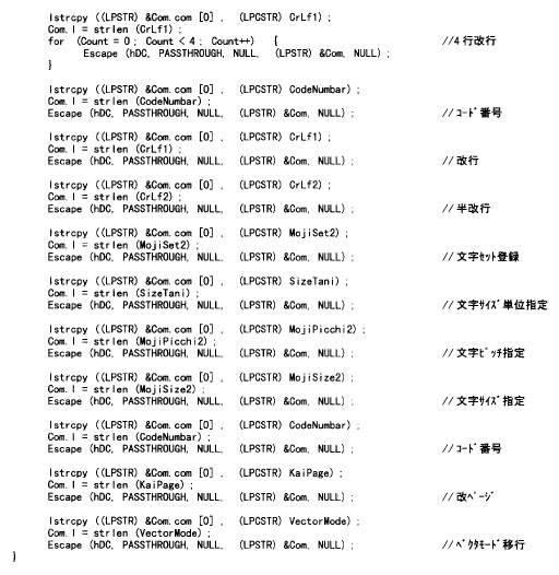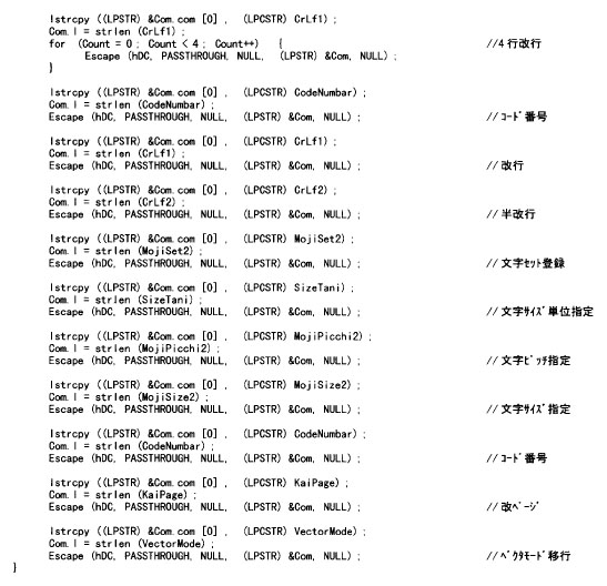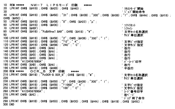 LIPSモードで、「A1234567890A」のNW-7のバーコードとOCR_B文字でコード番号を印刷する場合。(メインプログラムは「VC++用共通サンプルメインプログラム」を参照)