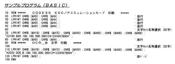 ESC/Pのエミュレーションモードで、3ドットモジュール、高さ100ドットの「*1234567890*」のCODE39のバーコードとOCR_B文字でコード番号を印刷する場合。