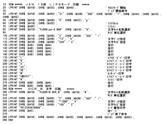 LIPSモードで、文字コードの置換による方法でJAN13桁のバーコードとOCR_B文字でコード番号を印刷する場合。(メインプログラムは「VC++用共通サンプルメインプログラム」を参照)