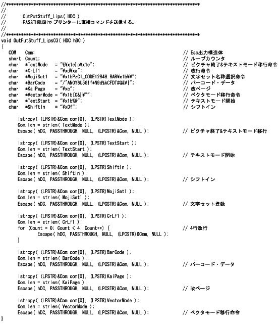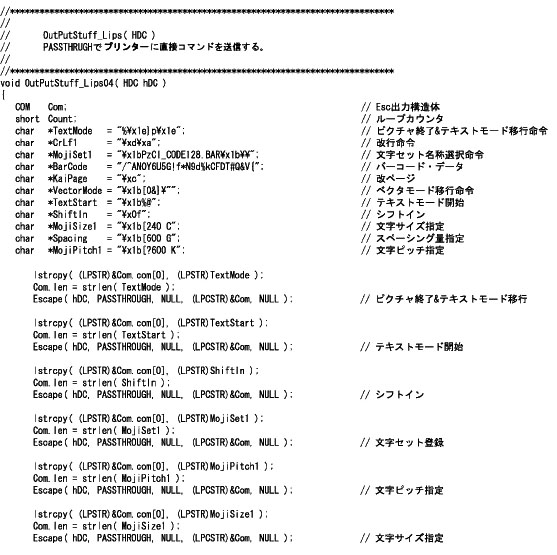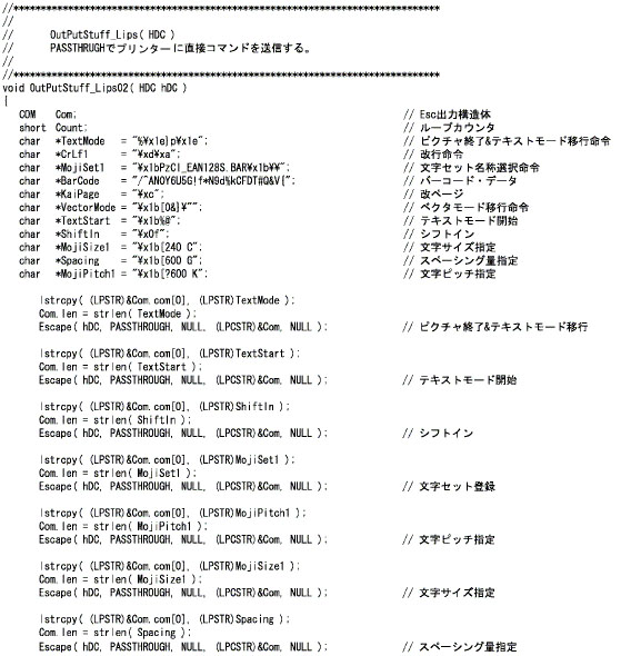 LIPSモードでドットフォントを使用し、EAN-128のバーコードを印刷する場合。(メインプログラムは「VC++用共通サンプルメインプログラム」を参照)