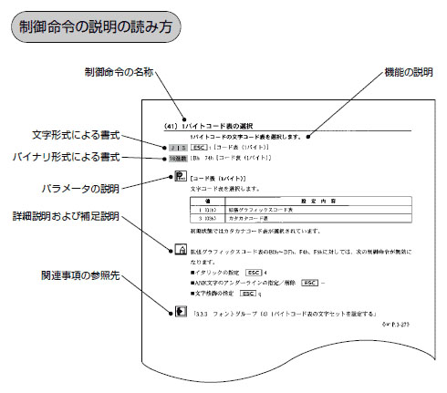 文字の修飾や書式指定など、ESCやFSに続くコードと併せて、2バイト以上でプリンターの制御を行うことのできる制御命令です。
