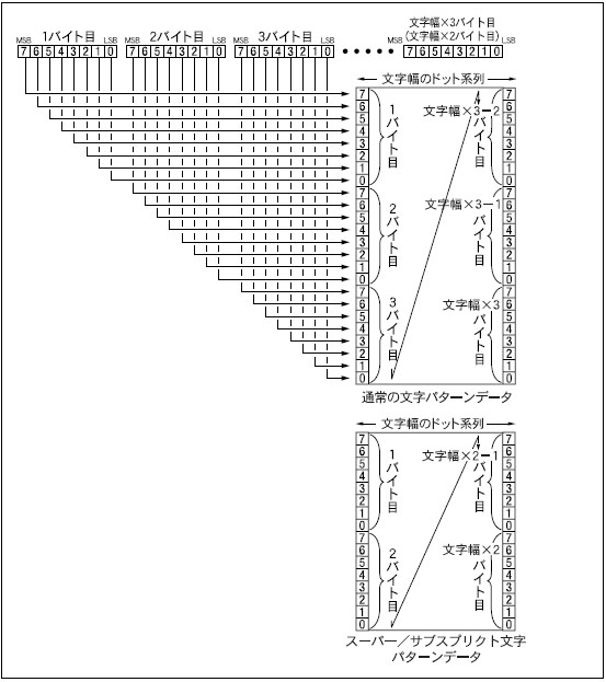 また、スーパー/サブスクリプト文字の場合は、文字の縦方向の16ドットを2バイトで表し、これを文字幅で指定したドット数分となります。たとえば、文字幅9ドットのときは、2×9で18バイトになります。