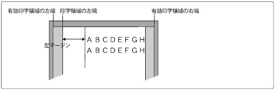 左マージンの設定後に文字ピッチを変更しても、左マージン位置は変化しません。また、右マージンと同じ位置または右マージン位置を超える値は設定できません。ただし、左右マージンの間隔が1文字未満の場合でも、1文字は印字します。
